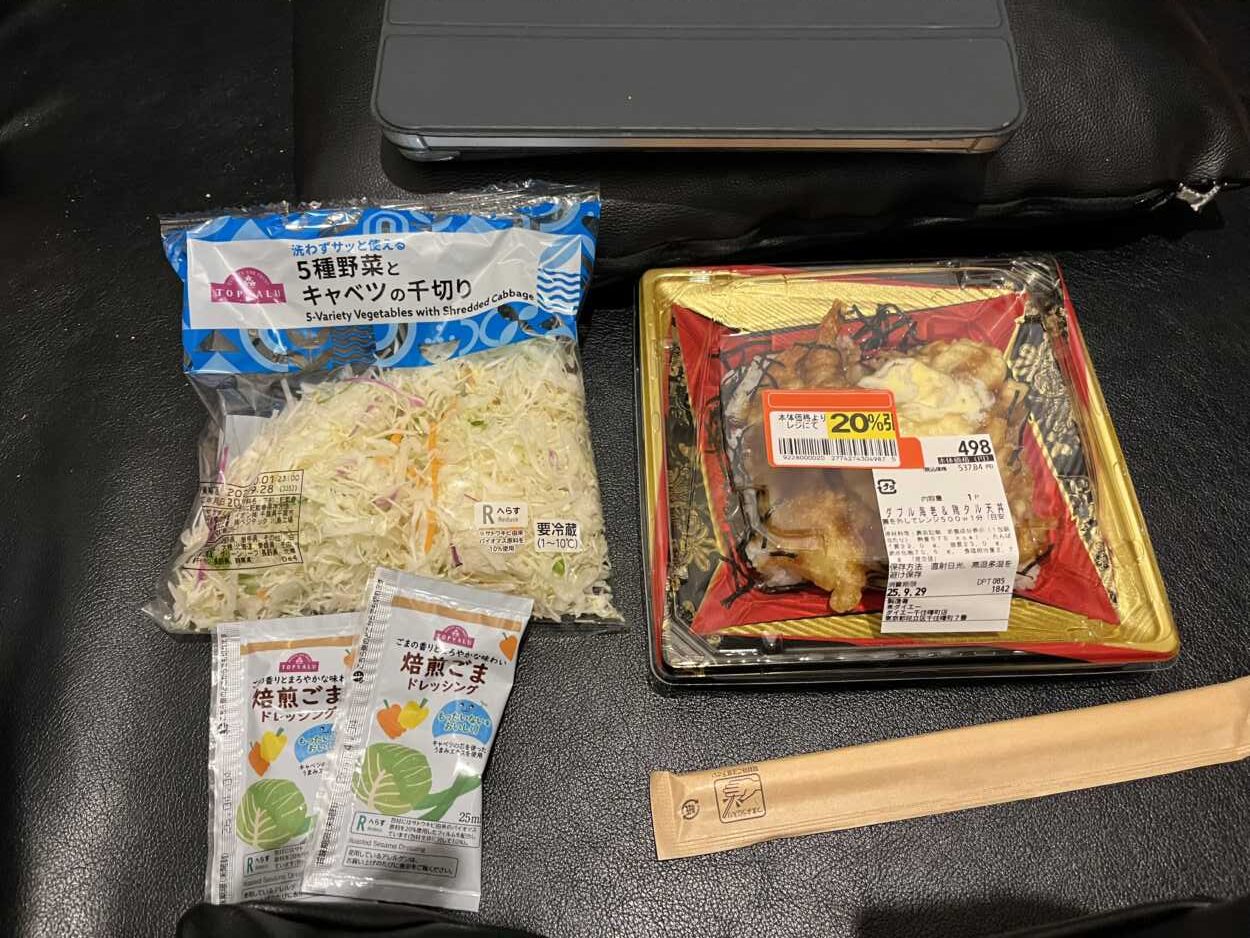 全国盲導犬協会に、100円、寄付して、買物に、行き、たまごや、野菜サラダに、ダブル海老&鶏タル天丼、