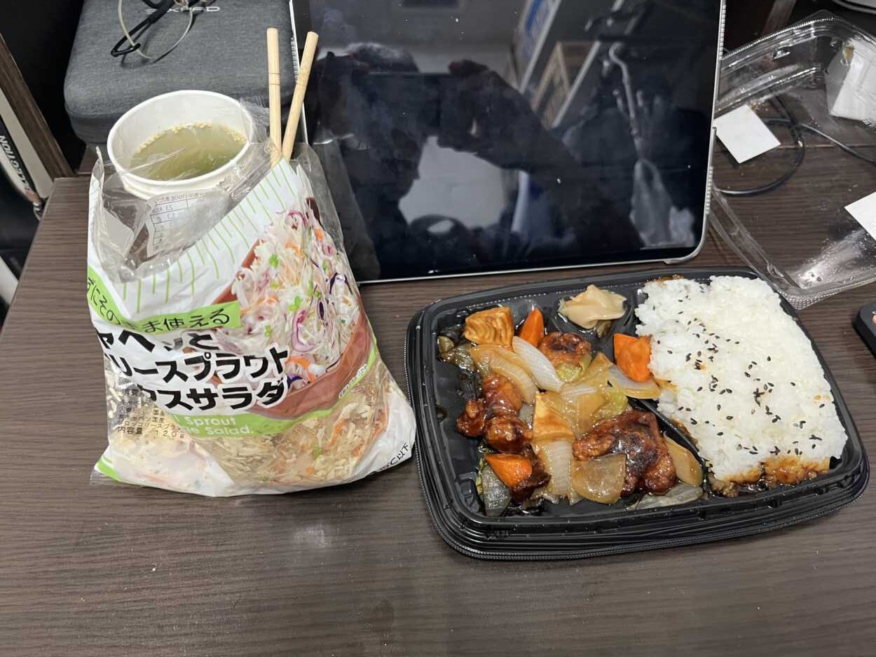 納豆、どん兵衛、野菜サラダ、コロッケ、酢豚弁当を、買って、清算して、